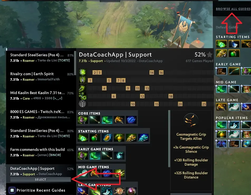 - Tu dois relancer Dota pour voir tes guides sélectionnés dans le jeu !