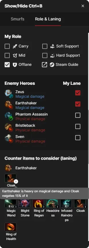 Tu peux aussi choisir ton rôle [carry/safe lane, mid, offlane, core ou soft/hard support] et les héros que tu risques d'affronter en lane. Sur cette base, Dota Coach te recommandera des objets pour contrer en laning phase. Note que tu devrais combiner ces objets avec ceux recommandés par nos guides dans Dota 2.