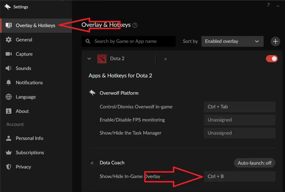 Les raccourcis de l'appli peuvent être modifiés dans les paramètres de l'application Overwolf.
