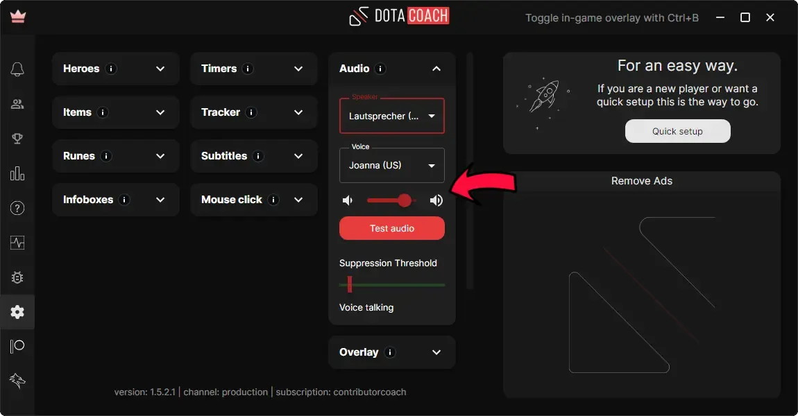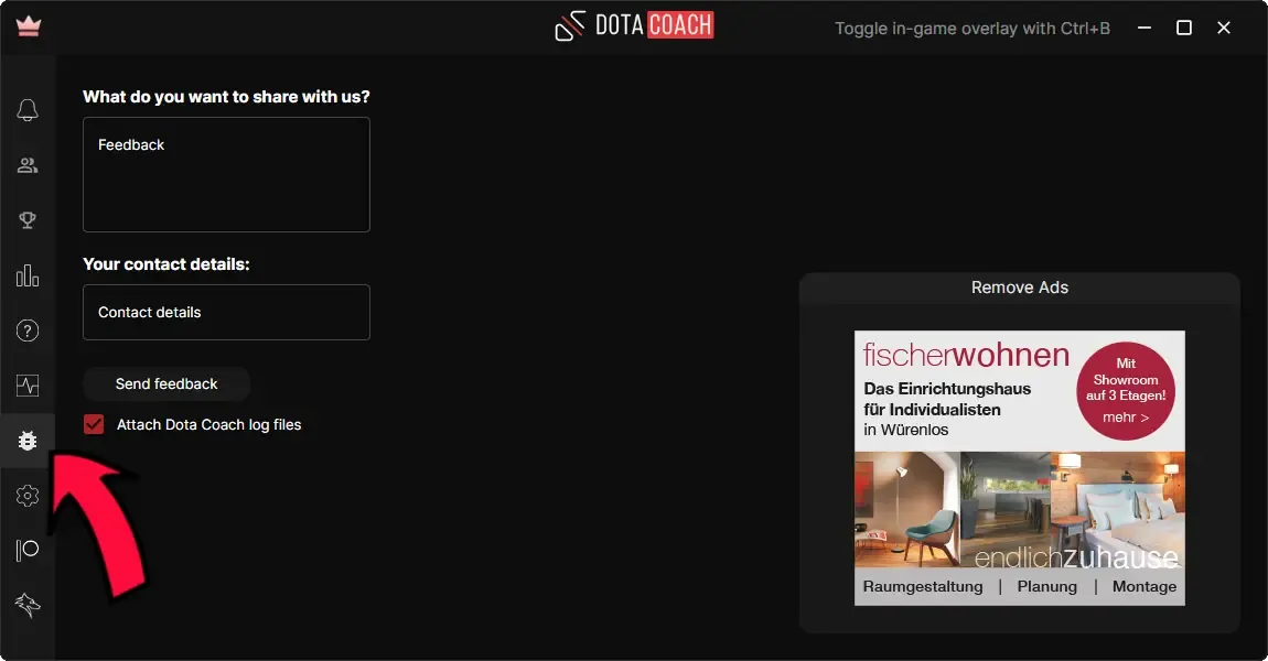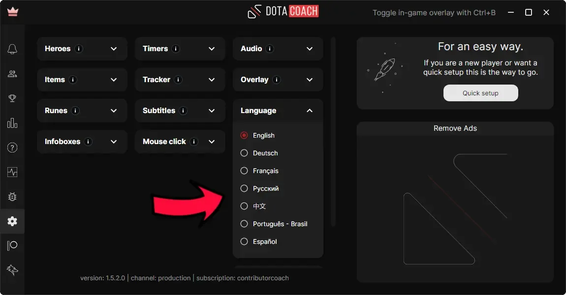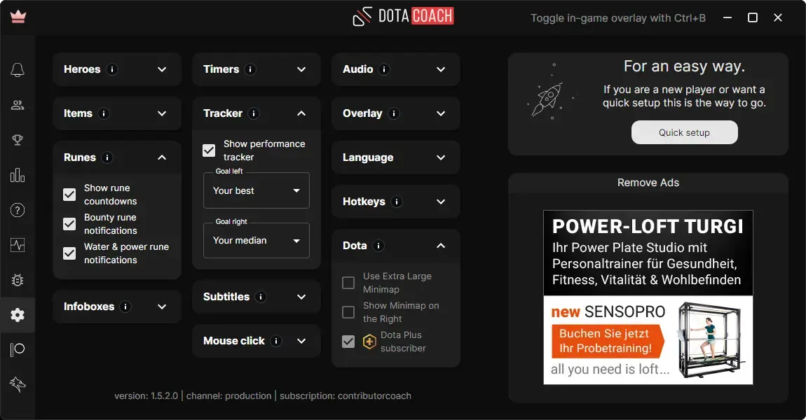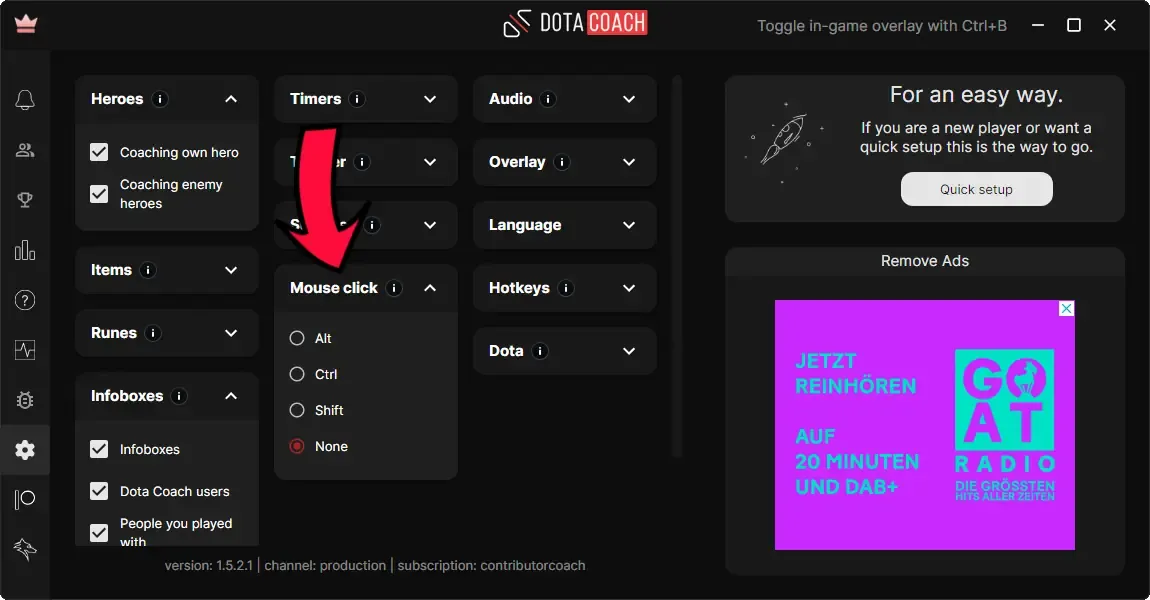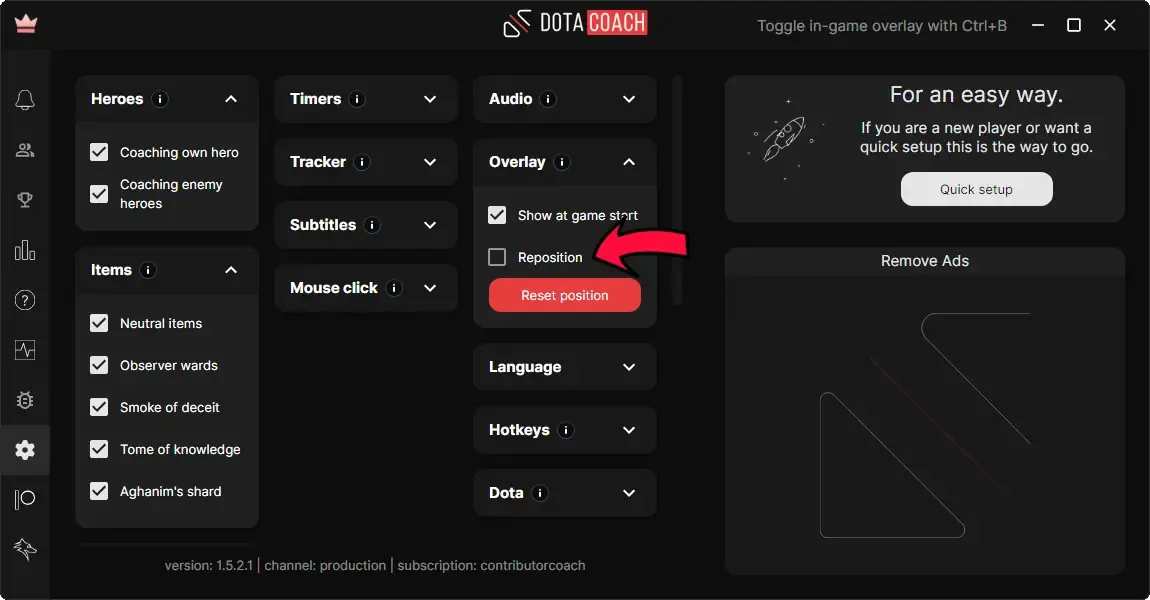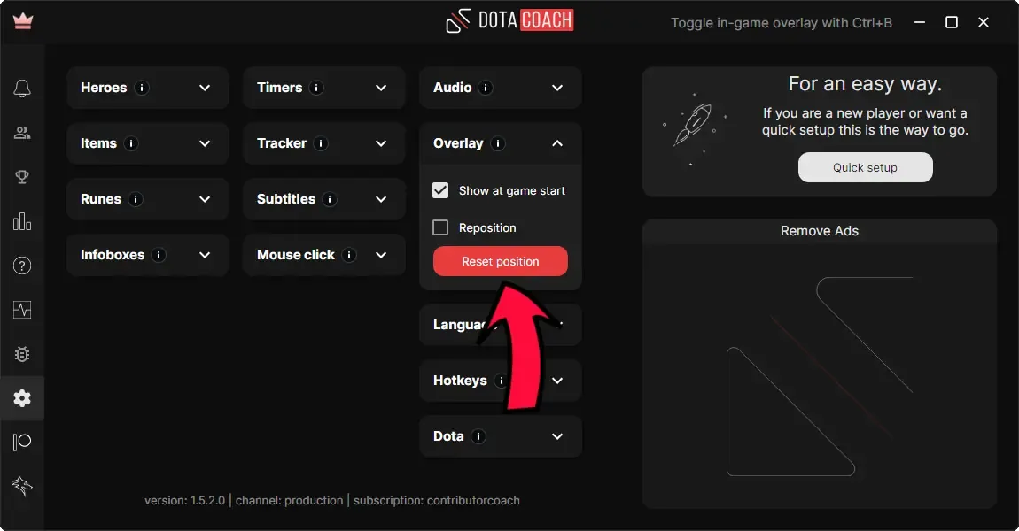 - Cliquez sur la petite roue crantée à côté du logo Dota Coach.