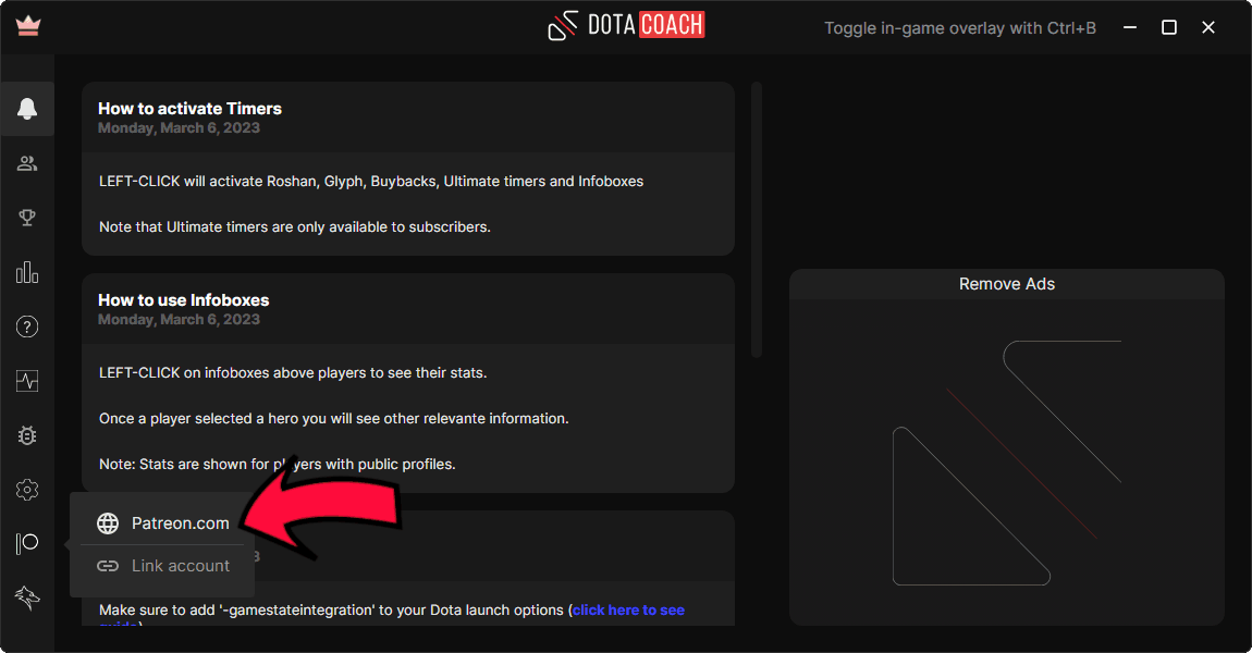 - Lie ton compte Patreon à Dota Coach (voir capture d'écran ci-dessous)